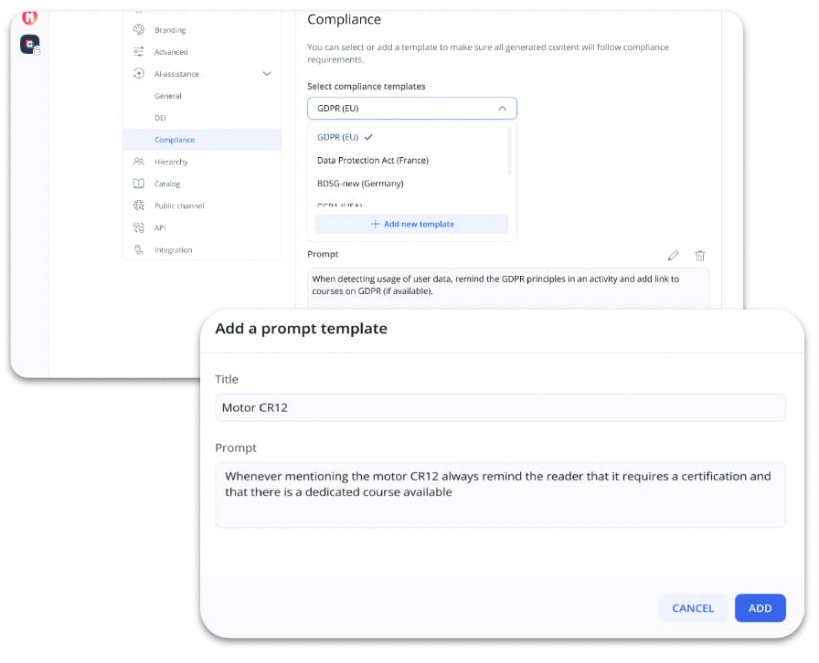 By leveraging ready-to-use templates or customised prompts, you can decentralise content creation to your SMEs and ensure that employee training meets company requirements and policies such as DEI or compliance.