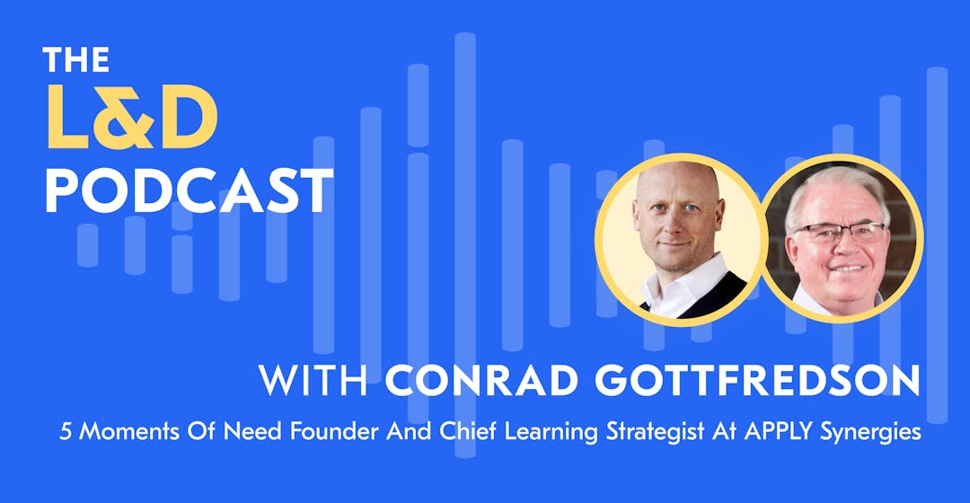 In this L&D Podcast recap post, I talk to Conrad Gottfredson, pioneer of the 5 Moments of Need methodology. Conrad has more than 30 years of experience in the L&D consultancy field, and is a widely recognized expert on workflow learning. That’s why my discussion on getting to the bottom of what workflow learning really is–and how it can help organizations and L&D teams–was so fascinating and thought-provoking.