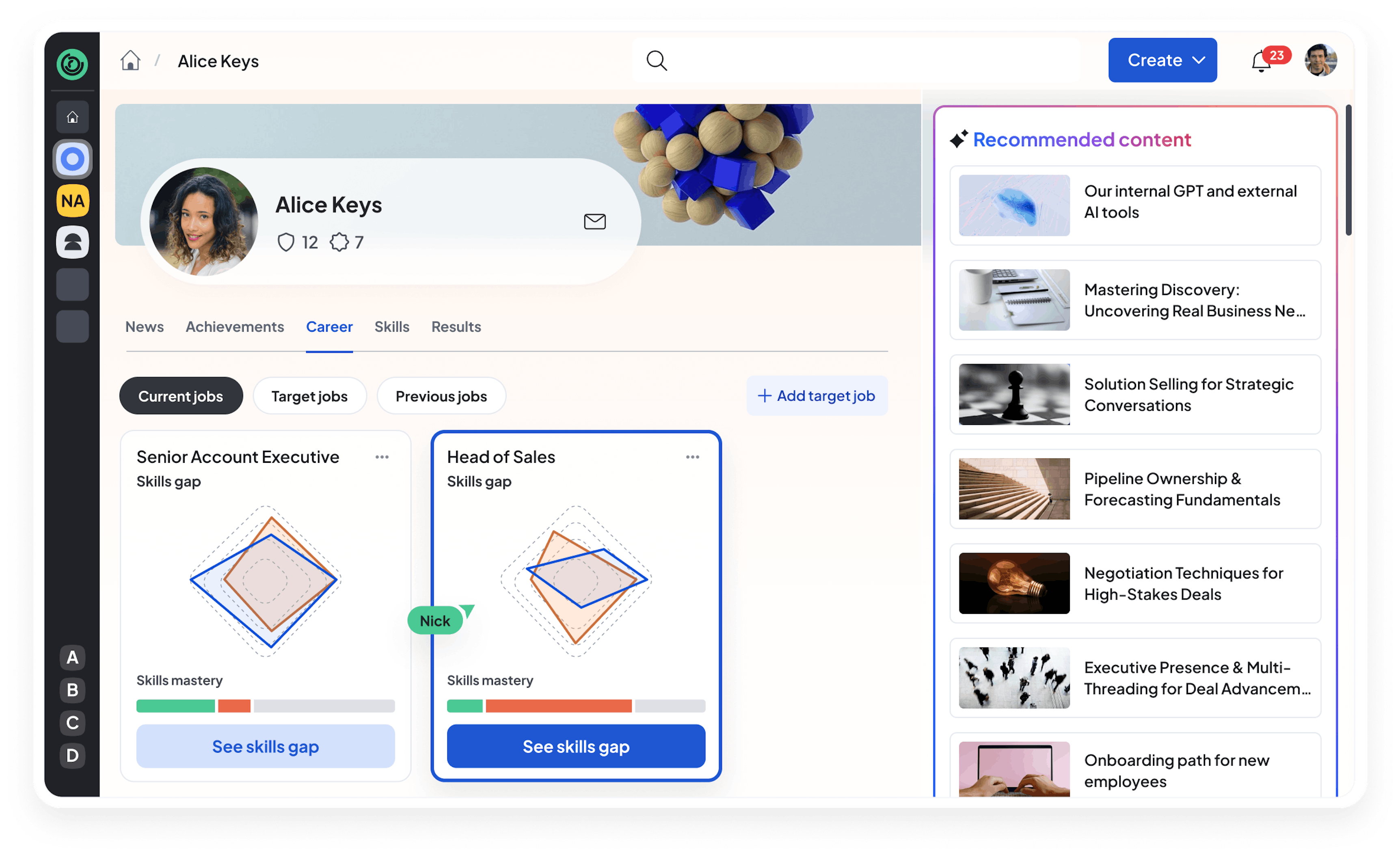 Support career growth with dynamic profiles that show role history, targets, and skill gaps. Plus, an interactive chart for visualizing progress and launching self-assessments.