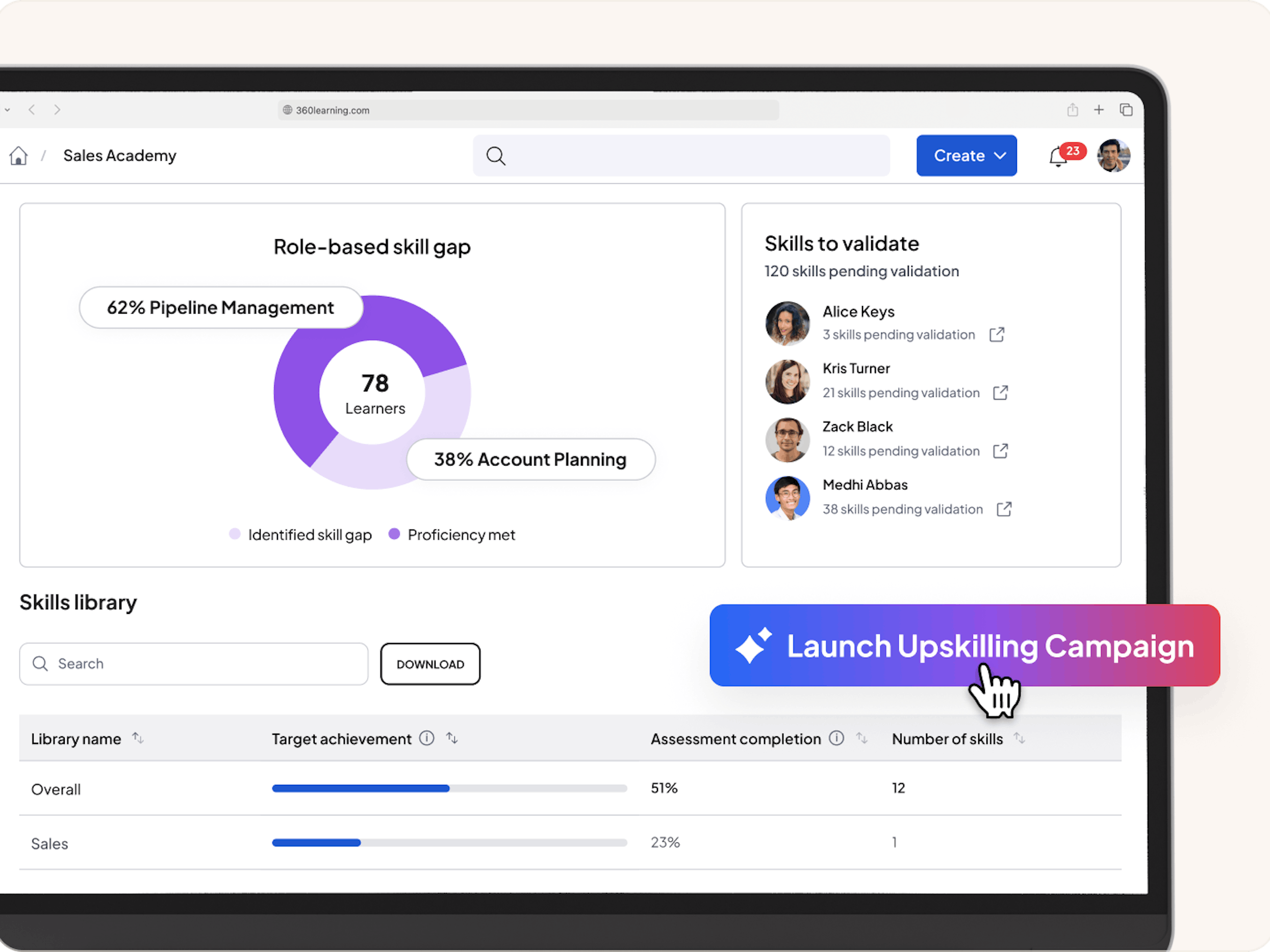 Skills gaps prevent high performance. Launch upskilling and reskilling campaigns that deliver the right content to the right learner at the right moment in their development. Go beyond completion rates and measure real impact by tracking skill growth and closing gaps.