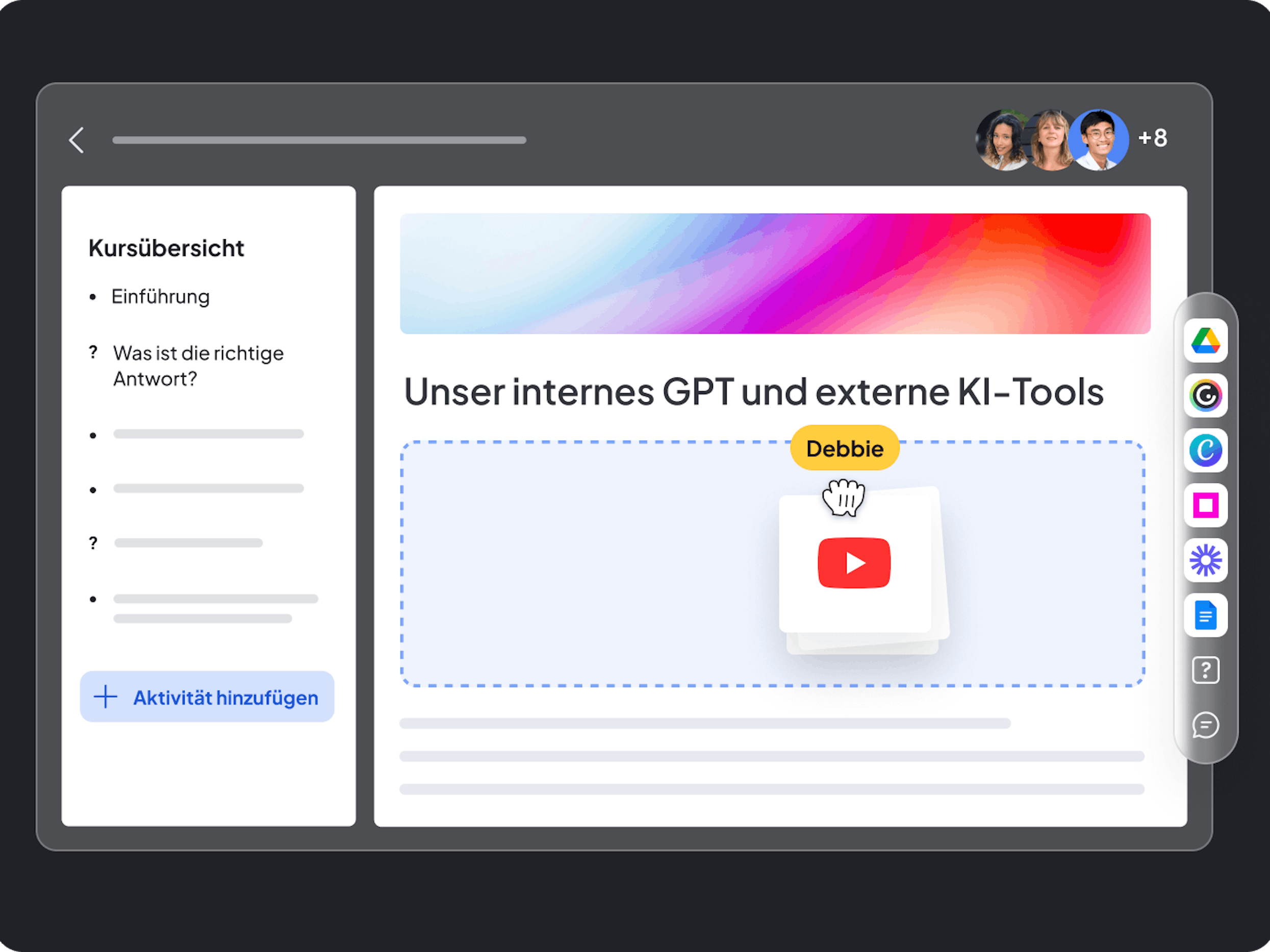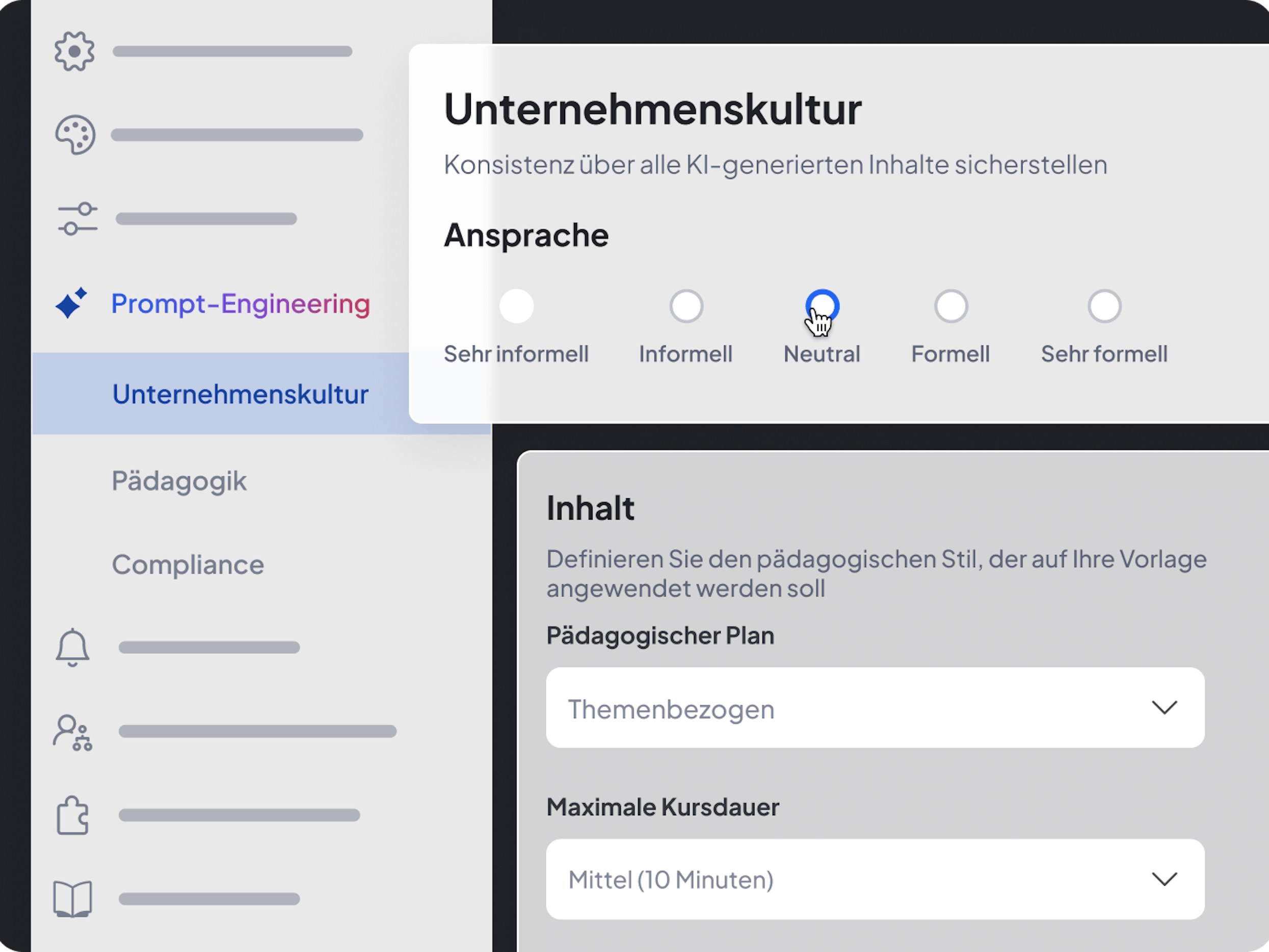 Nutzen Sie unsere KI-Funktionen, um Lerninhalte einfach zu erstellen, auf Ihre firmeninternen Richtlinien und Lernziele anzupassen und relevante Schulungen minutenschnell zu liefern.