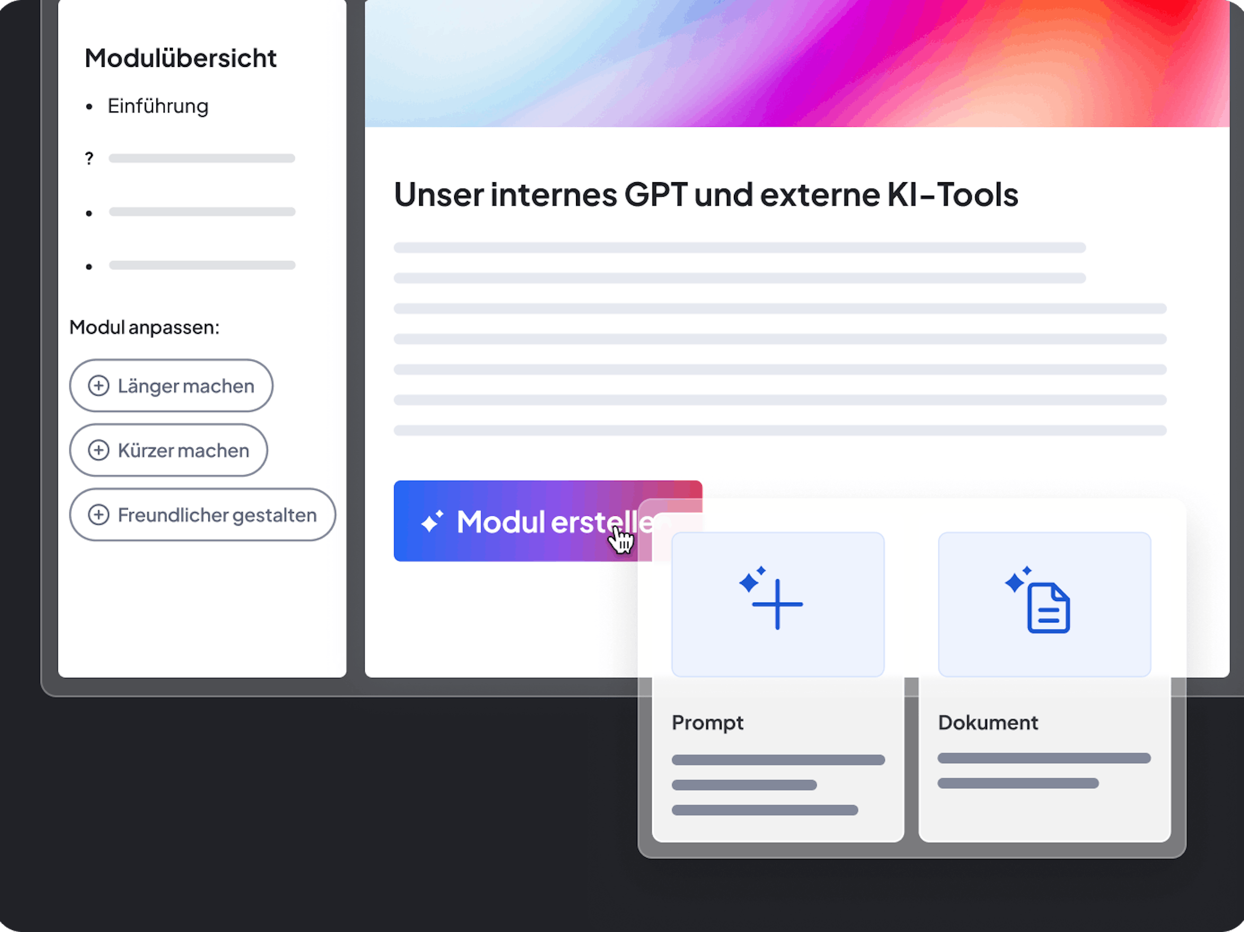 Mit KI-Unterstützung entstehen Ihre Module im Handumdrehen. Einfach ein Thema eingeben, smarte Vorschläge erhalten und ohne Schreibblockade durchstarten. Effizient und stressfrei.