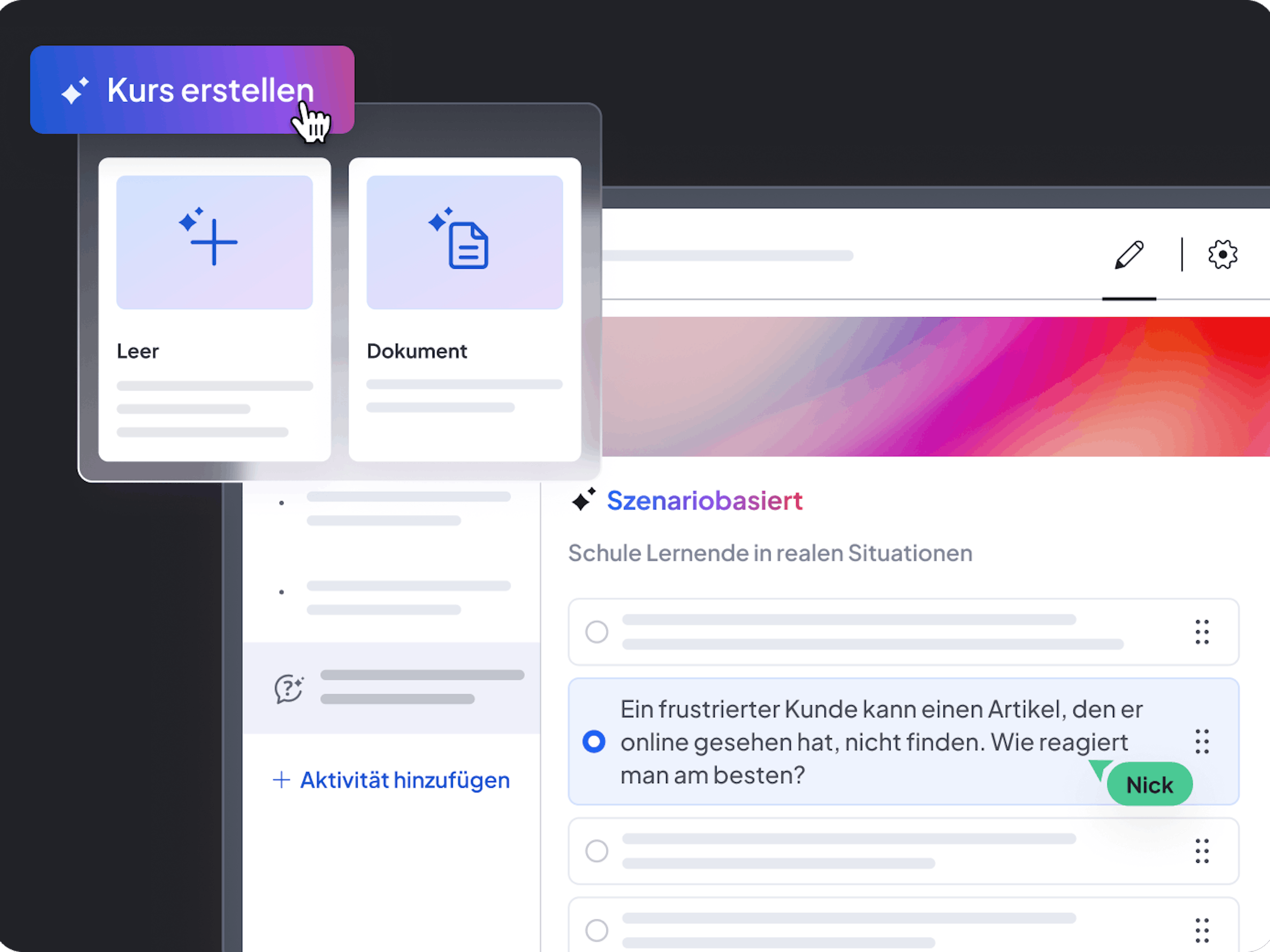 Content-Erstellung beschleunigen, ohne Kompromisse bei der Qualität. Verwandeln Sie Expertenwissen in strukturierte Kurse – mit KI-gestützten Gliederungen, smarten Fragen und interaktiven Elementen. So kann Ihr Team schneller entwickeln, besser zusammenarbeiten und Lernerlebnisse schaffen, die wirklich im Gedächtnis bleiben.