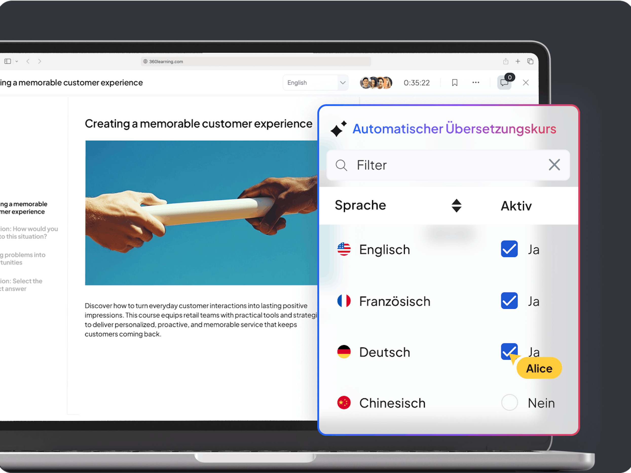 Die mühsamen Teile von L&D automatisieren – Übersetzungen, Moderation, Reporting – und dabei die volle Kontrolle behalten. KI ermöglicht einen schnelleren Rollout und sorgt für globale Reichweite Ihrer Lernprogramme. So können Sie den Fokus auf Strategie setzen, nicht auf Tabellenkalkulationen.