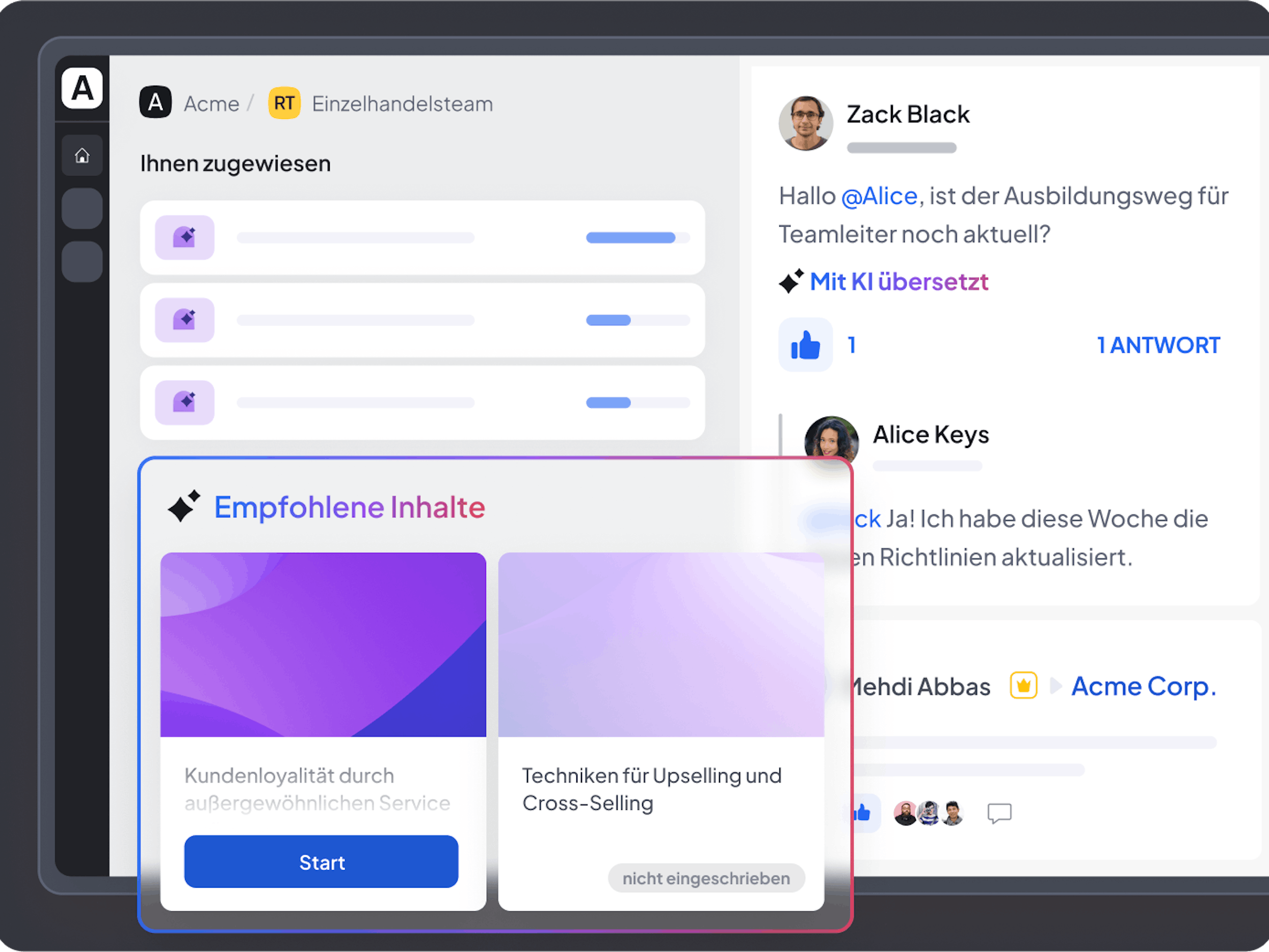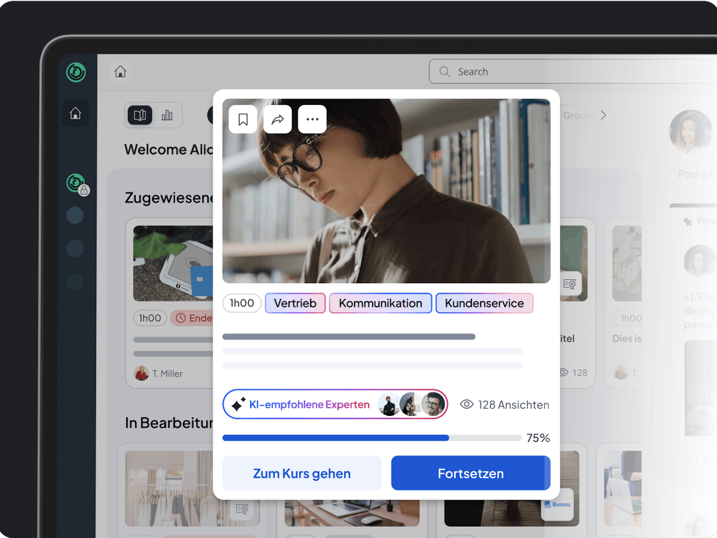 Relevante Lerninhalte bereitstellen, die sich an Ihre Mitarbeitenden anpassen. KI ermöglicht personalisierte Inhalte, maßgeschneiderte Lernpfade und Unterstützung in Echtzeit. Das fördert die Lernmotivation, das Selbstvertrauen und die Kollaboration untereinander – ohne zusätzlichen Aufwand für Ihr Team.