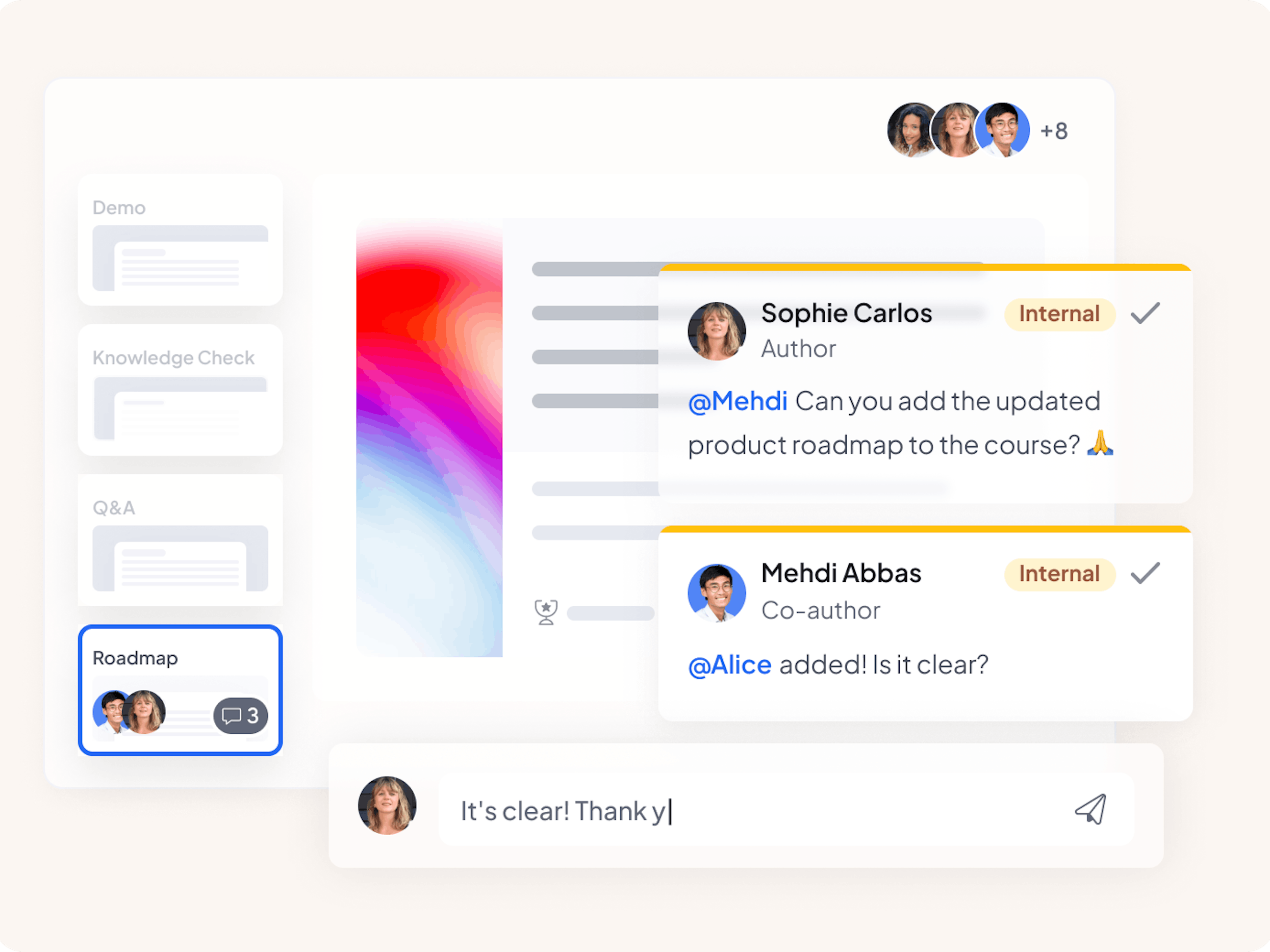 Bring in internal experts to create relevant courses faster. Course authors can share feedback and suggestions in a private forum that only authors can see–even after the course goes live.