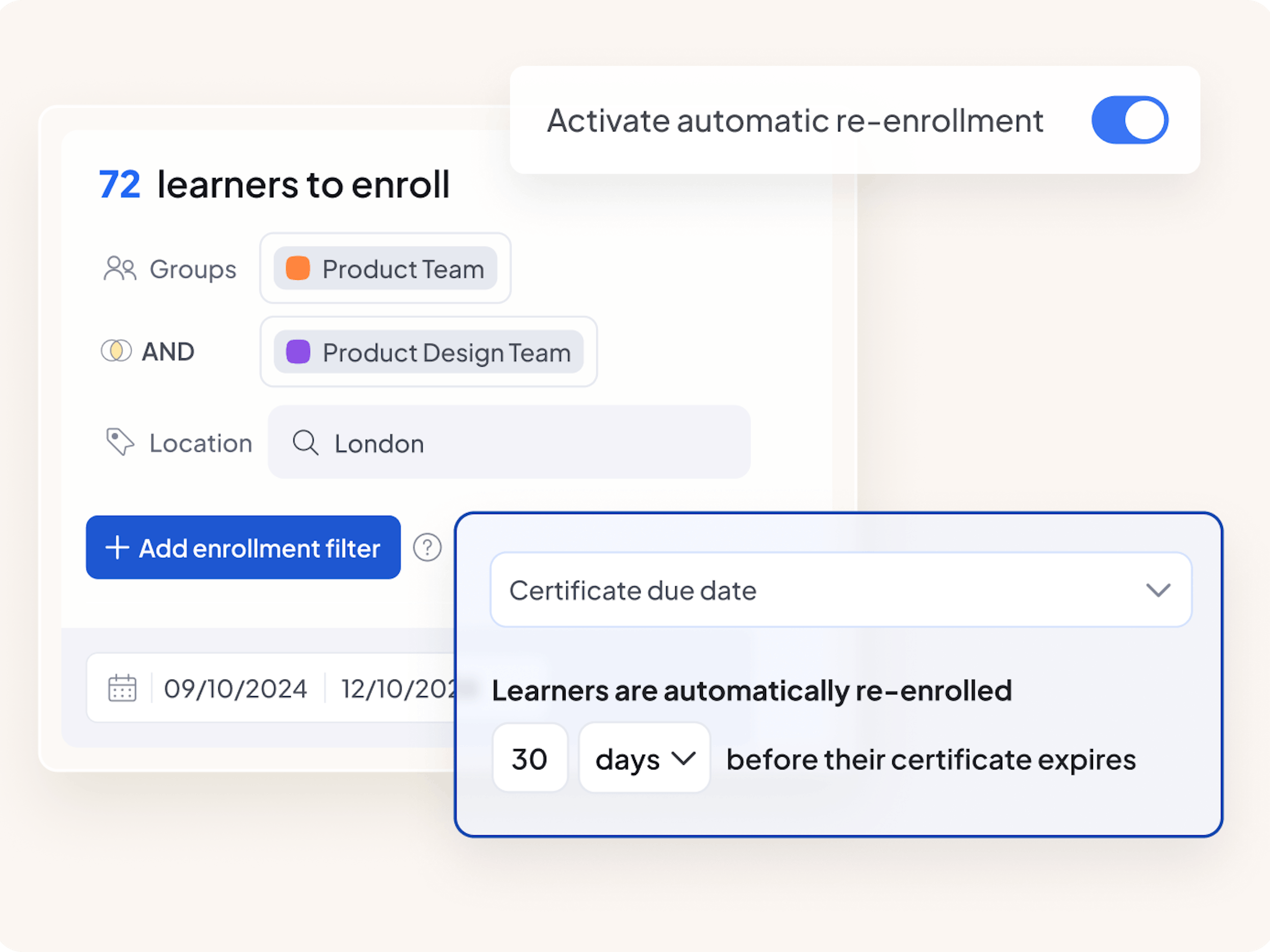 Enroll learners automatically when they meet the defined criteria, like when their certificate expires.