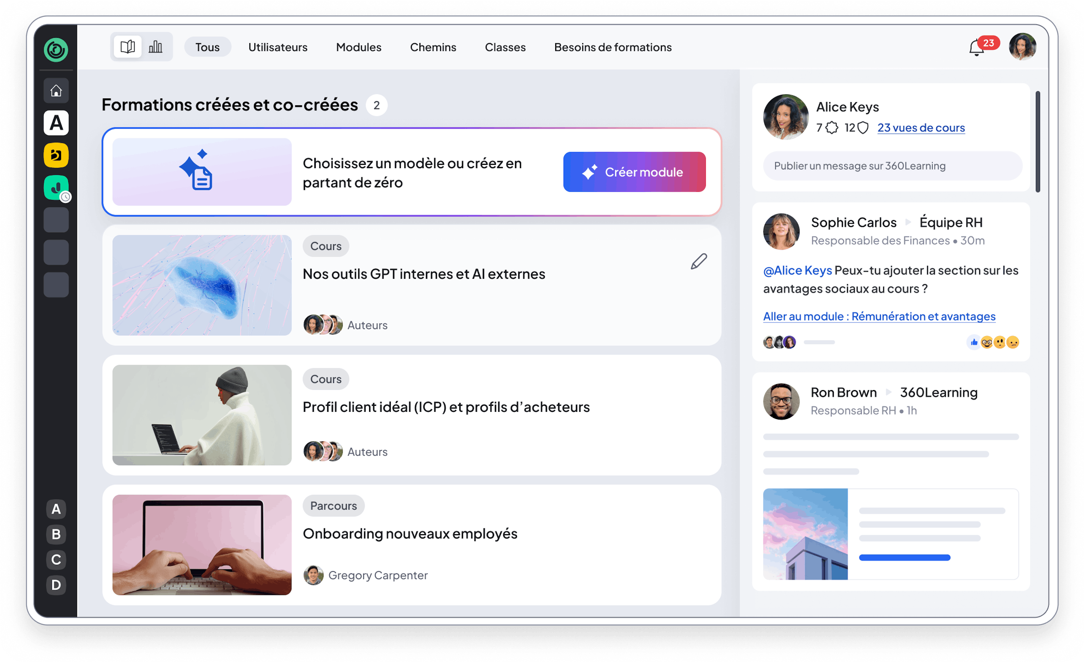 Les outils de création traditionnels ne vous facilitent pas la tâche. Avec des prompts 100% personnalisables, vos experts peuvent créer, itérer et collaborer sur des formations de qualité en toute confiance avec l'IA.