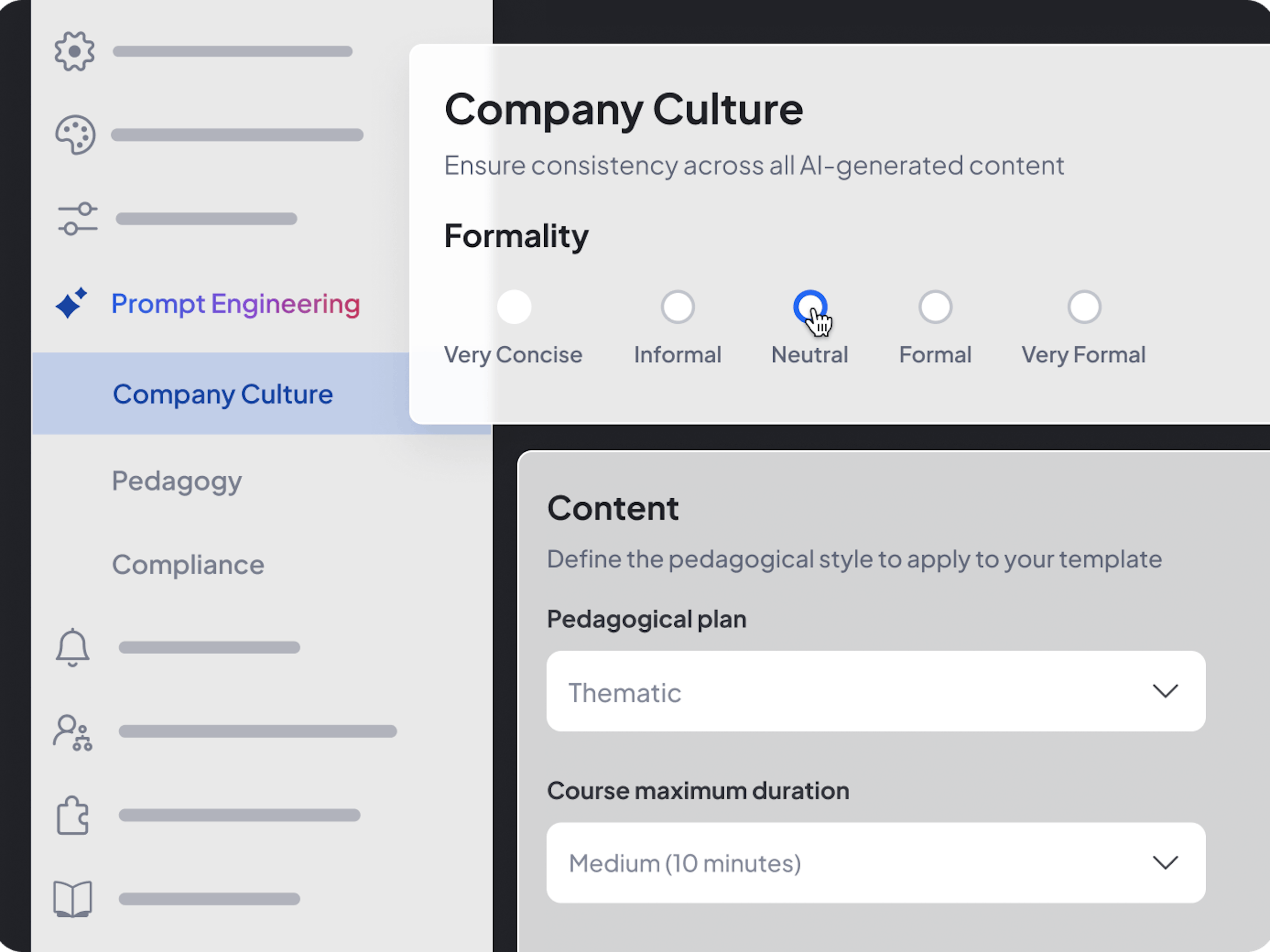 Decentralize content creation to internal experts with confidence via customizable prompts that meet company requirements, pedagogical strategy, and company policies.