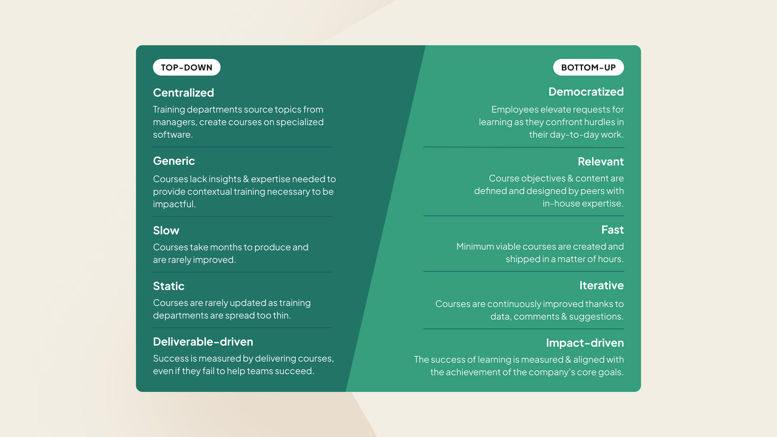 Most traditional corporate training is top-down, meaning management or L&D determines training needs and then creates or buys learning materials to meet those needs. In contrast, in a collaborative learning methodology, anyone on the team can make a request or create a learning need.