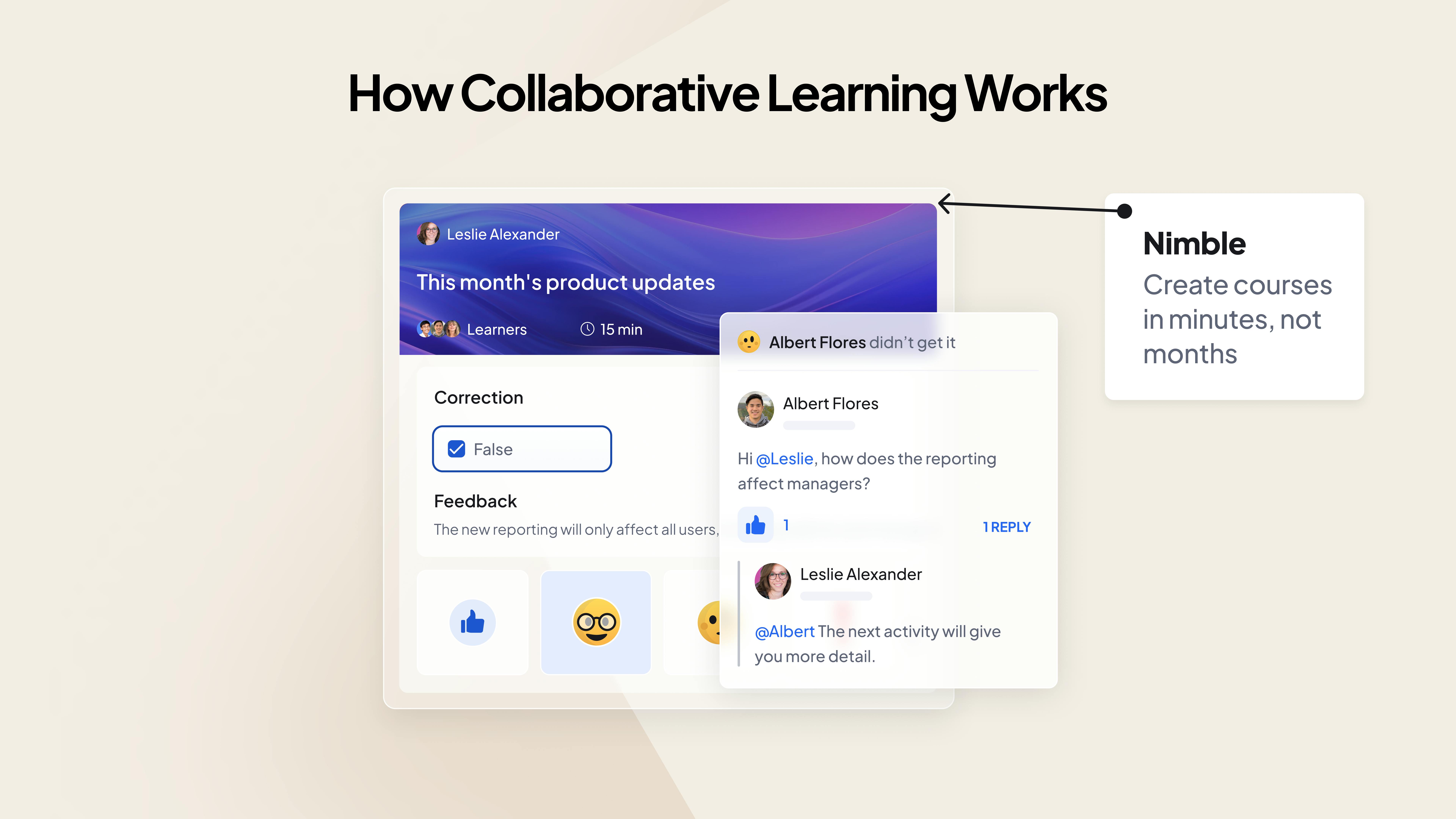 Because course creation has traditionally been slow and expensive, updates and refreshes have been infrequent. Collaborative learning prioritizes making it easy to create and edit course materials, which means it's far easier to update them based on new information or employee feedback.