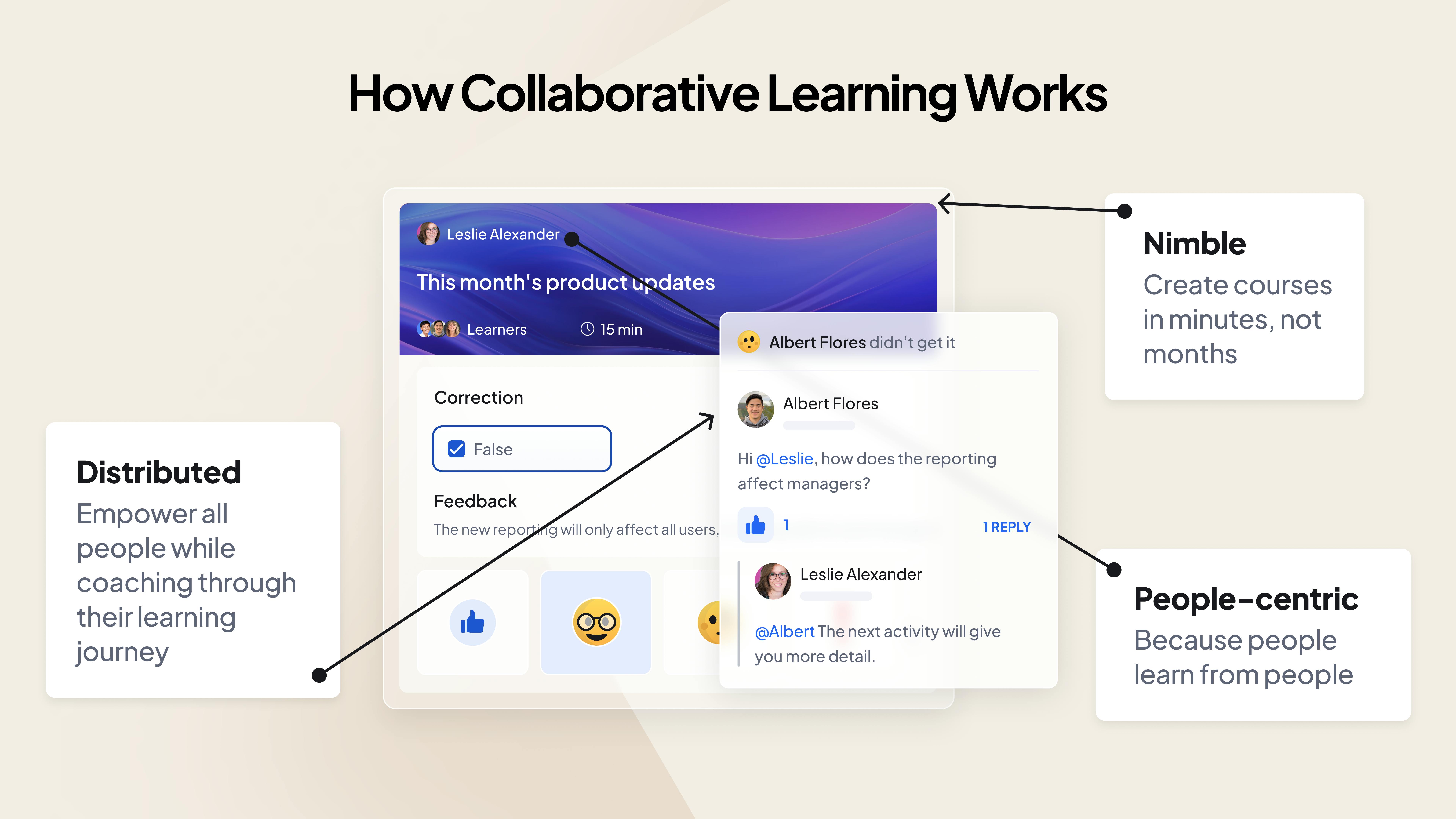Collaborative learning connects people together, allowing them to declare learning needs, share their skills and expertise, and create learning content quickly to answer urgent questions. This way, organizations can respond to opportunities for growth quickly and more effectively.